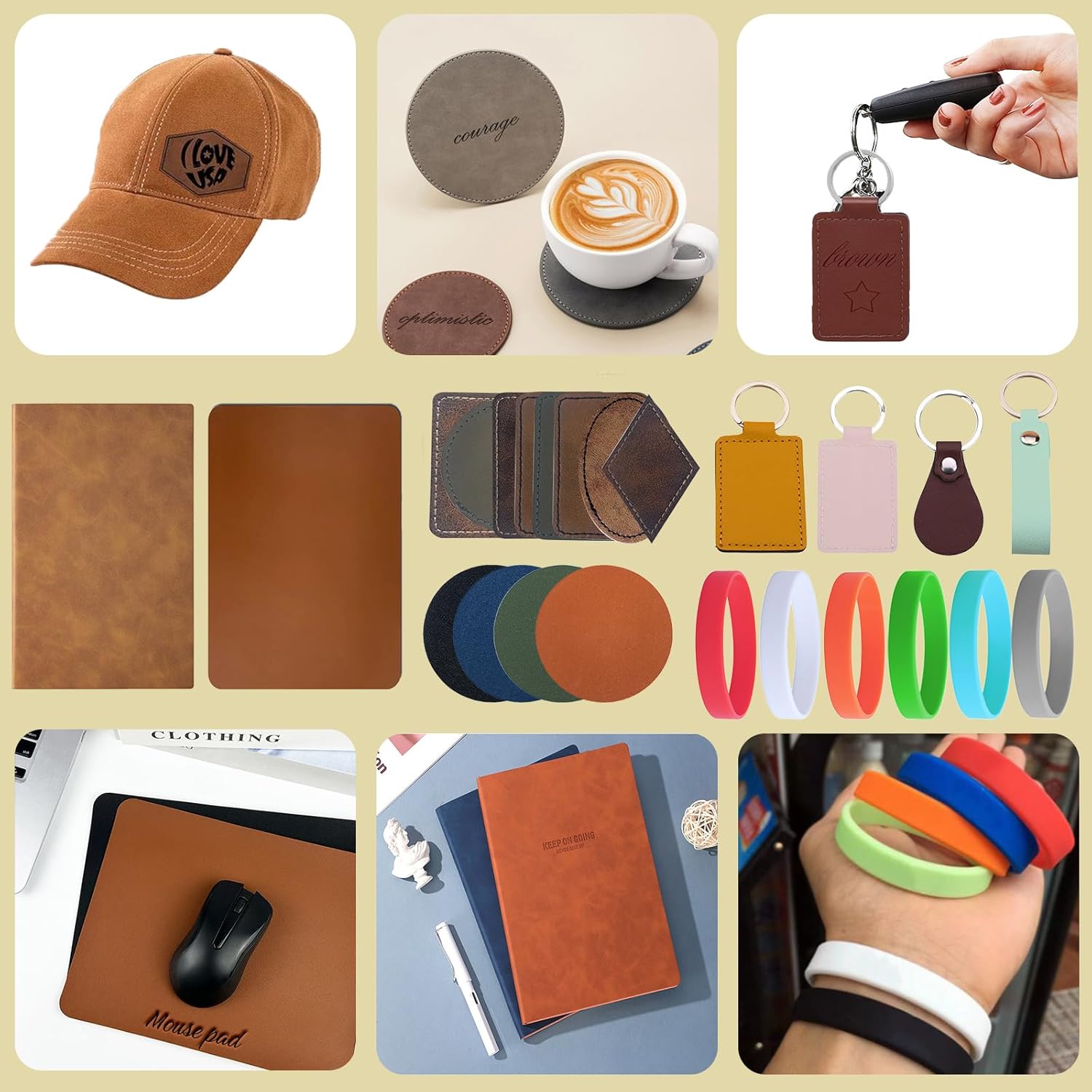 Laser Engraving Material Kit: This kit includes a total of 144 types of engraving materials. It is designed to meet your laser engraving and cutting needs, covering 29 types such as glass, wood, acrylic, metal, fabric, PU leather, and paper. This engraving material kit can meet all the requirements of beginners for engraving materials and create various DIY projects