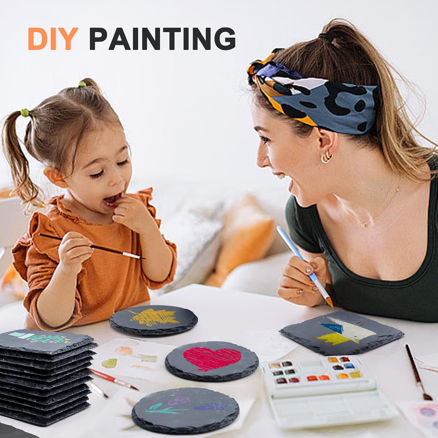 PERFECT SIZE: 4 inch 12 PCS round and 12 PCS square slate coasters with 96 pcs anti-scratch bottom. blank slate coaster thickness is 4-6 mm. When used as a stone coasters, it fits most standard cups, such as coffee mugs, beer glasses, wine glasses and drink containers