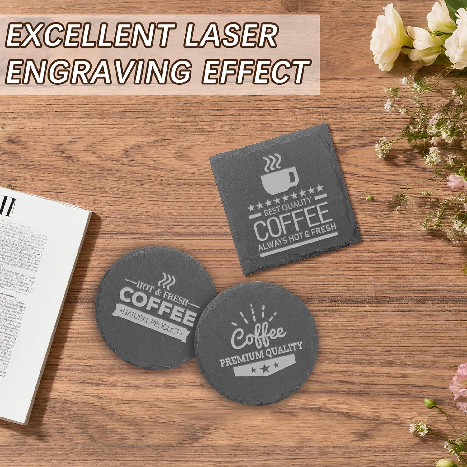 Customers give positive feedback about the coasters’ engraving capability, with one mentioning they’re perfect for laser engraving. However, the quality and thickness receive mixed reviews, with some customers expressing disappointment and noting that the coasters are thicker on one side.