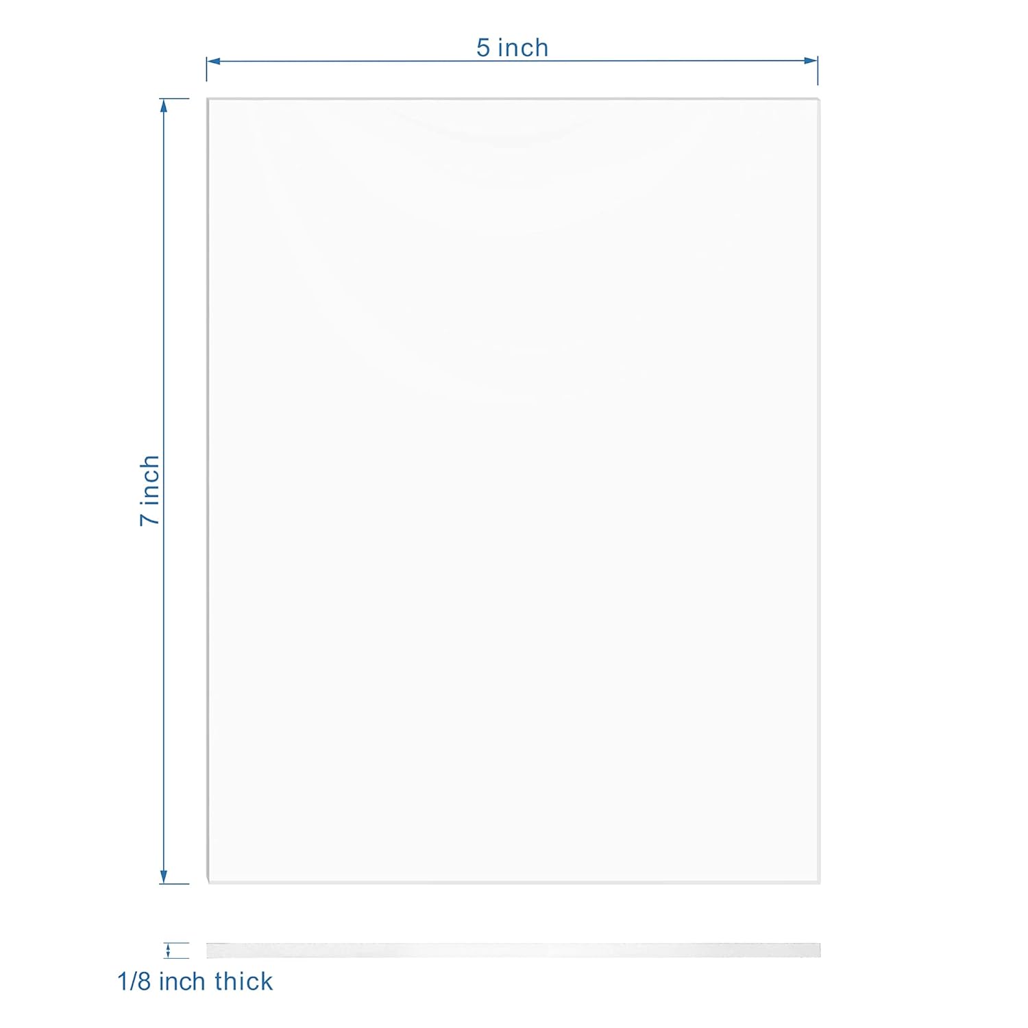 It measures 5 x 7 inches with 1/8 inch thick (0.118″ / 3mm nominal). Please remove the protective paper on both sides of the acrylic piece before use.